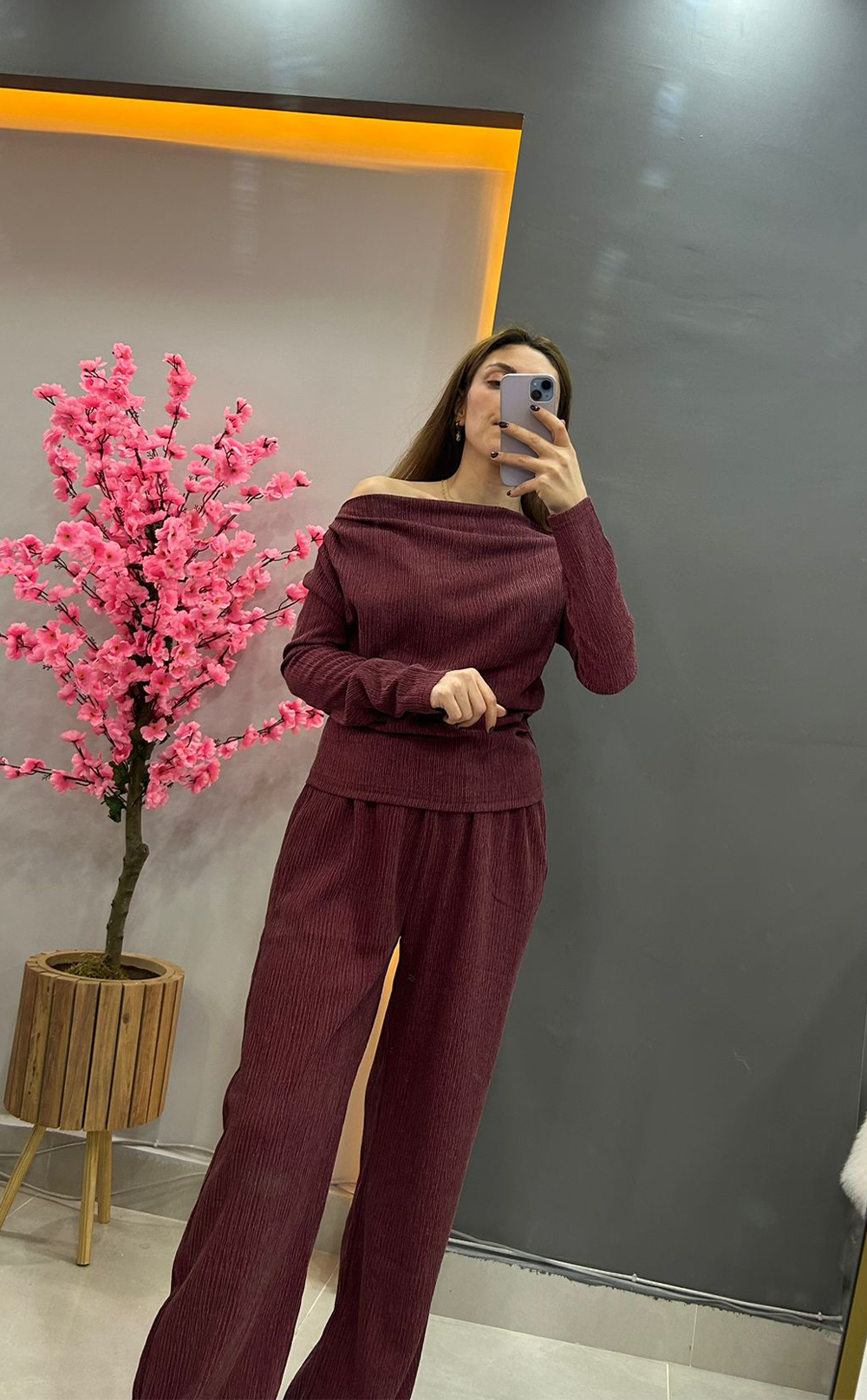 Kırmızı renkli likralı kumaş takım, şıklığı ve rahatlığı birleştirir. Hem ofis hem de günlük kullanım için uygundur.